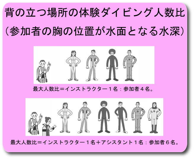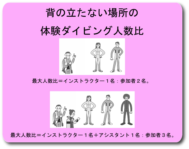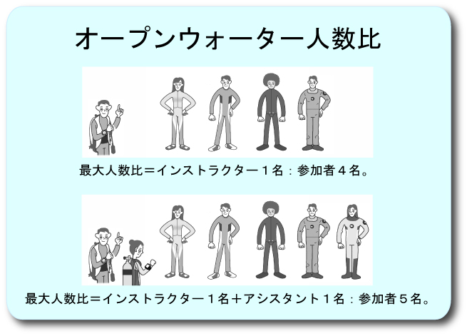 | ダイビング講習の開催は、下記の水域と人数比以下で行いましょう。