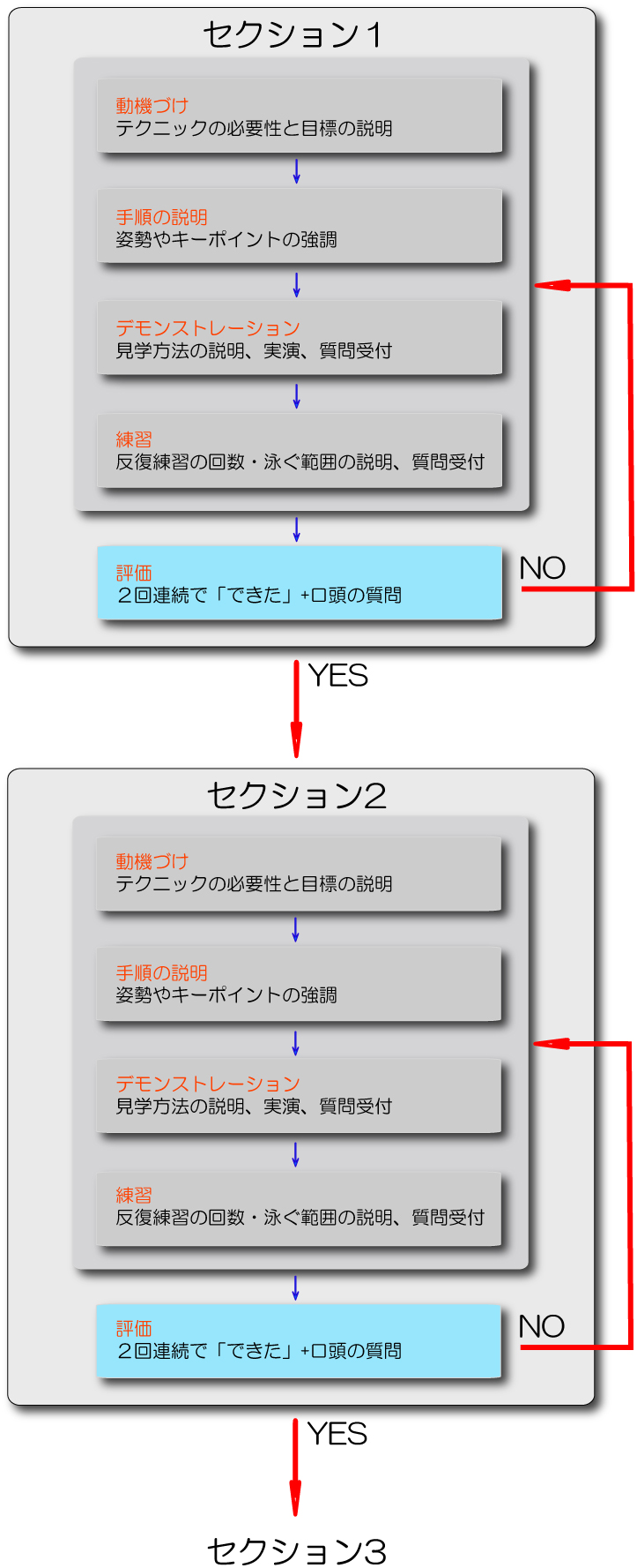 各セクションでは、「動機づけ→手順の説明→デモンストレーション→練習→評価」を行います。