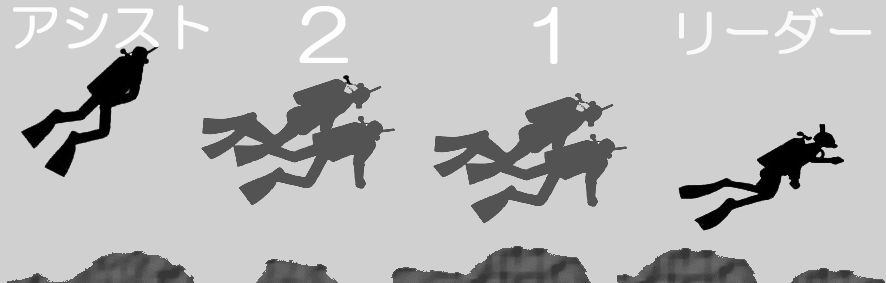 ⑪ダイブリーダーチェックシートの表面を使って、フォーメーション(インストラクター → バディ1 → バディ2 →アシスタント)を決めましょう。
