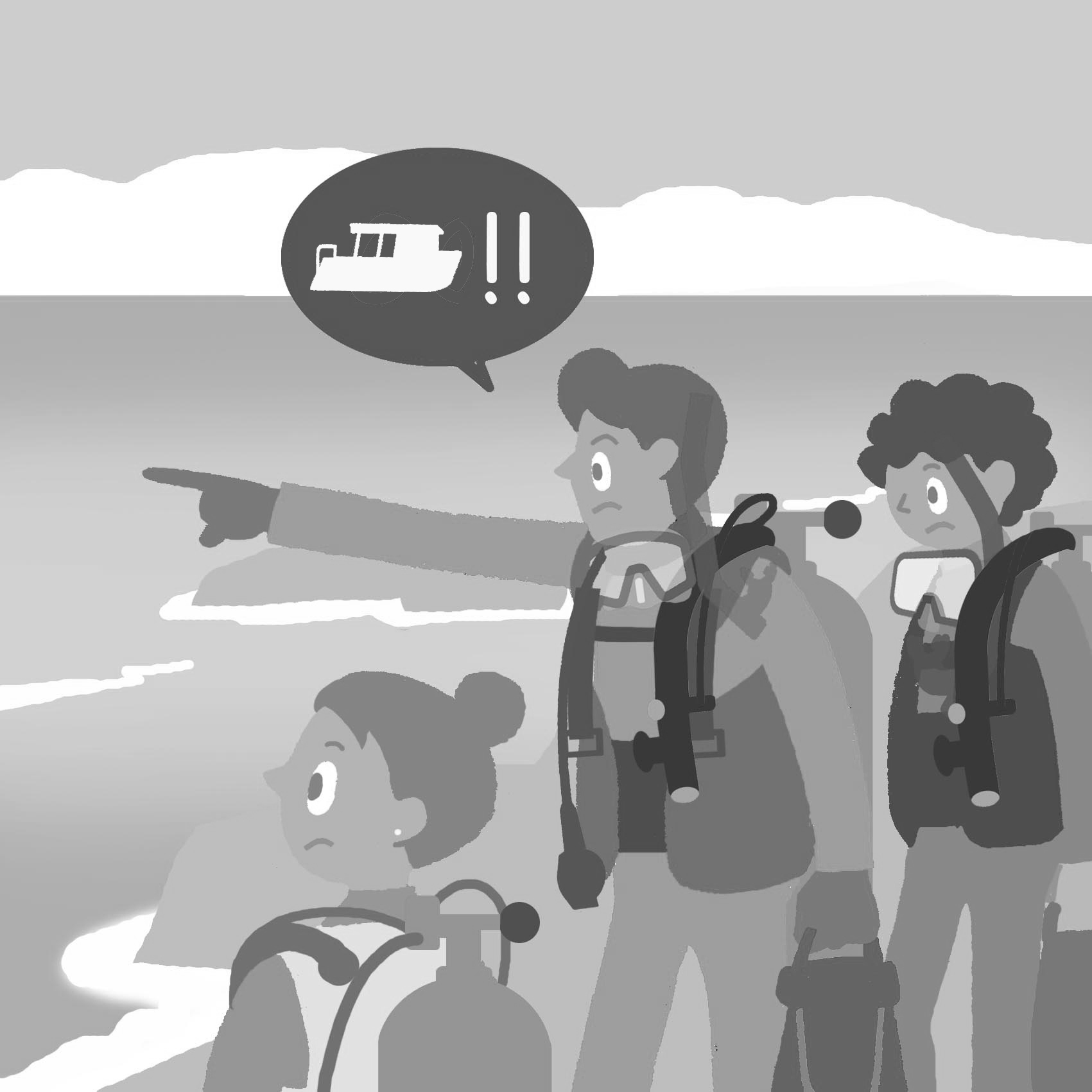 潜水コースや講習水域の水面に船舶航路や波浪がなく、安全に浮上や講習ができるか、潜水予定コースや講習水域全体を見渡しましょう。