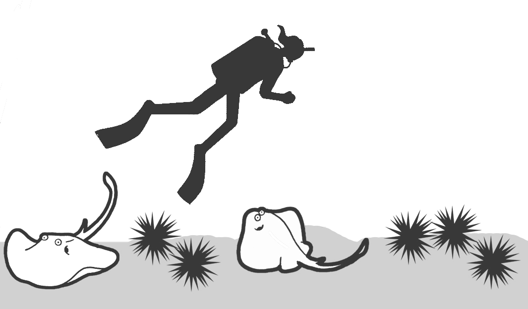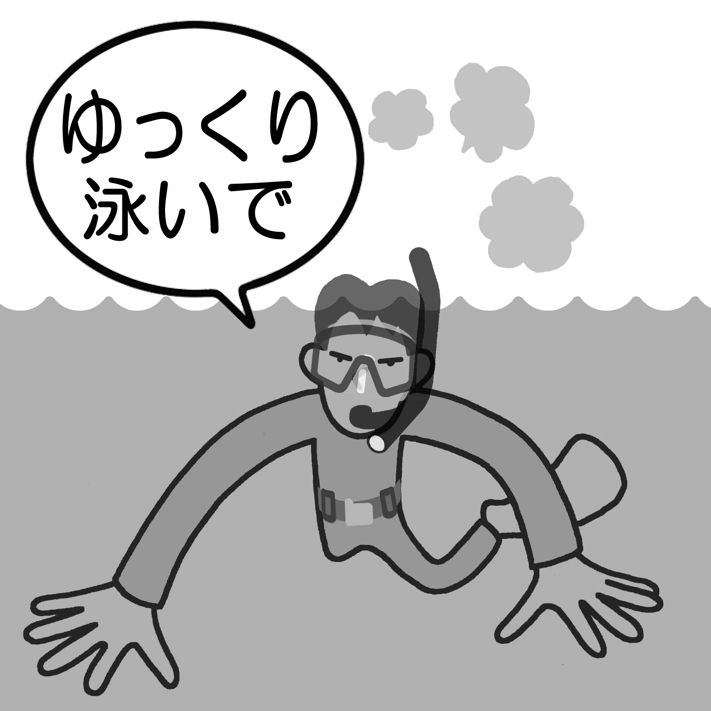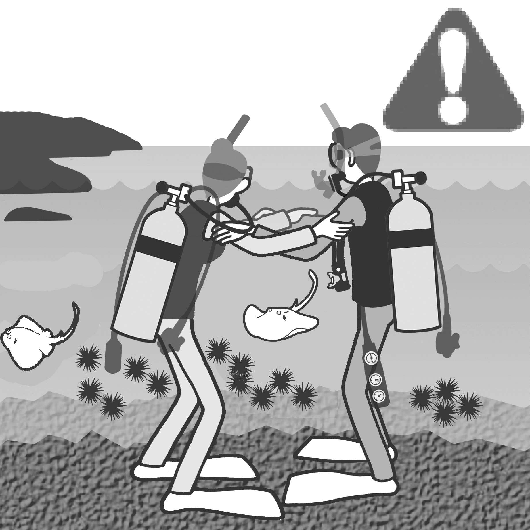 水面のダイバーが手や足をばたつかせていたら、パニックの前兆かもしれません。 海底から、水面のダイバーを常に観察しましょう。