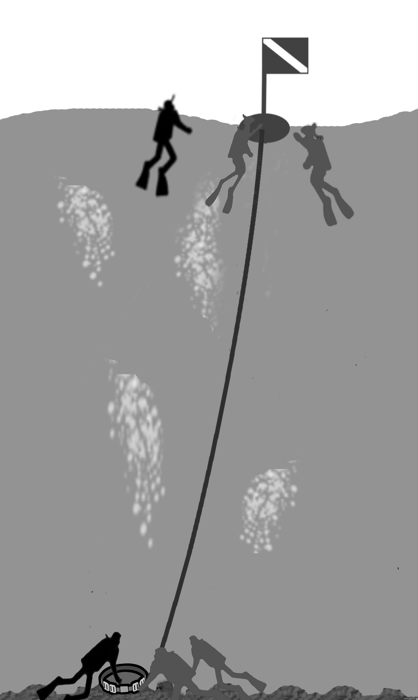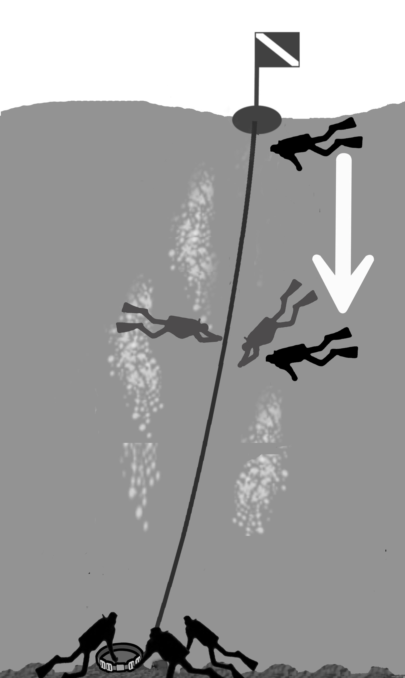 潜降ロープを中心とした狭い視界内で、潜降ロープに沿っているバディ1と水面フロート周りに待機するバディ2の動静確認します。