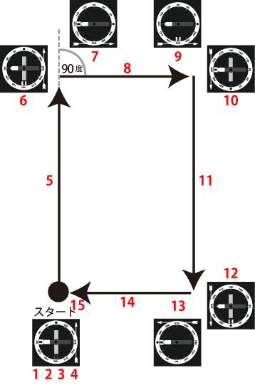 Make sure that the north side of the magnetic needle does not deviate from between the index marks, and move straight 5 steps (kick) toward the rubber line to stop. |