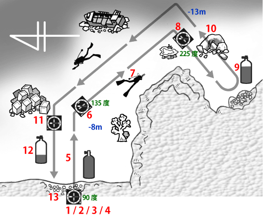 In addition, swim so that the north of the magnetic needle points to the compass direction recorded at 6, and move to a place where the terrain changes significantly. |
