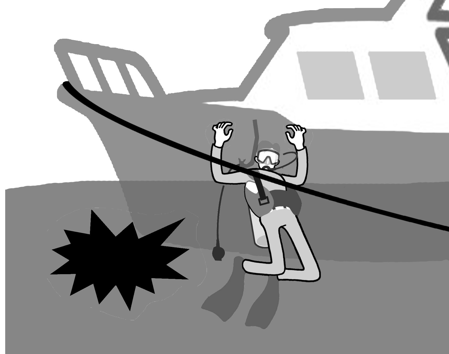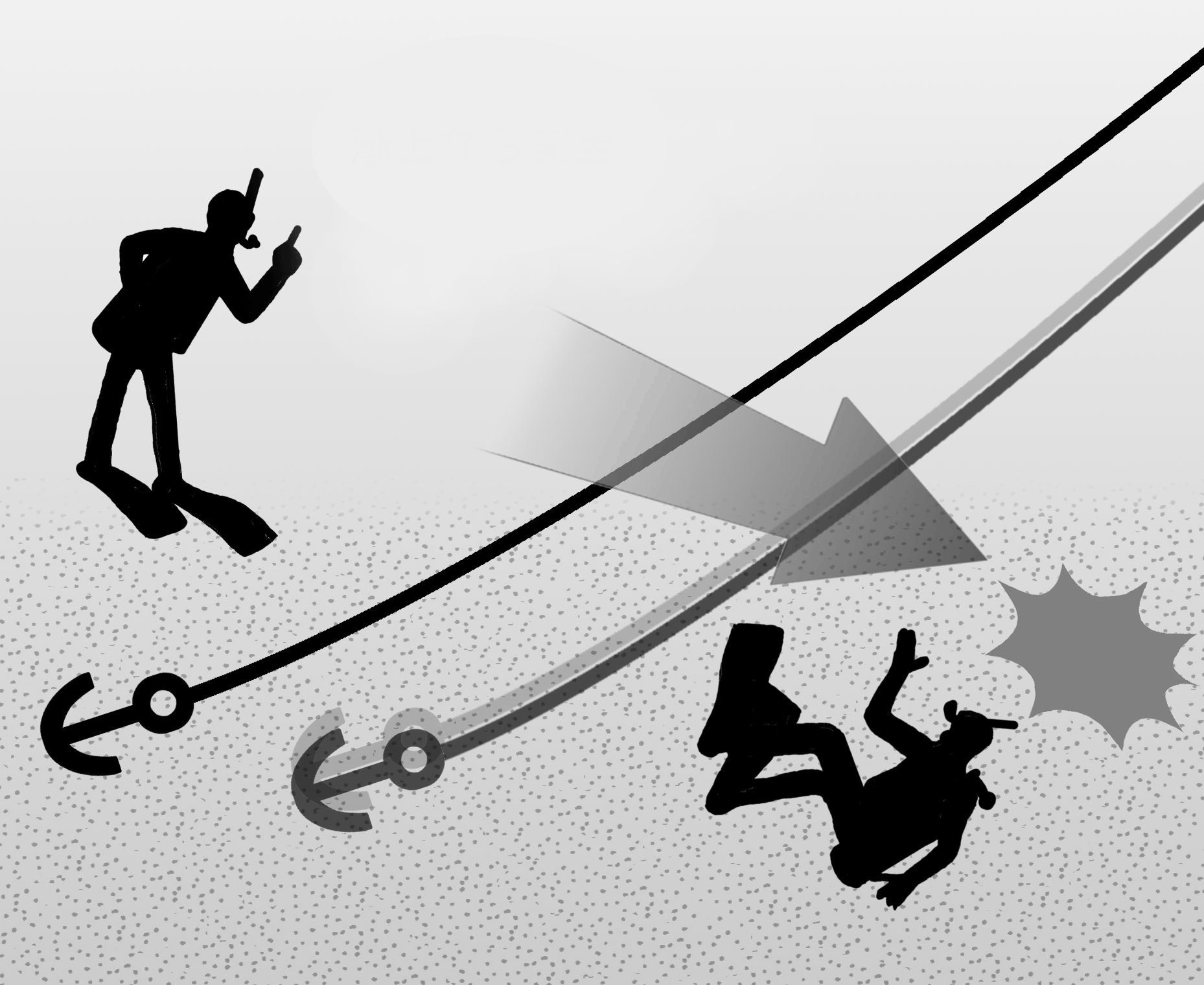 If you use an anchor line instead of a descent line on the surface, be careful not to get between the anchor line and the boat. |
