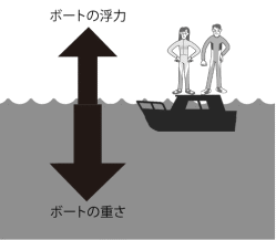 A boat floating on the surface of the water is in a state where the weight of the boat, which is the sinking force, is balanced by the buoyancy force (the weight of the water if the submerged part of the boat is made of water). |
