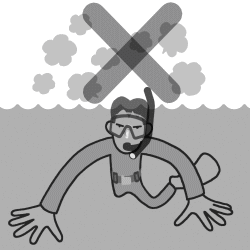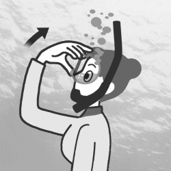 While pushing with your hand on the upper part of the mask’s frame, slowly blow air from your nostrils while gradually looking upwards towards the water’s surface.