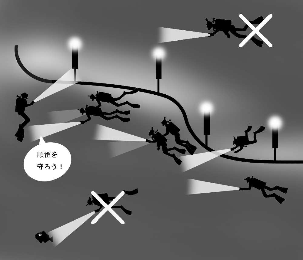 During poor visibility diving, underwater floats such as plankton block the light from underwater lights.