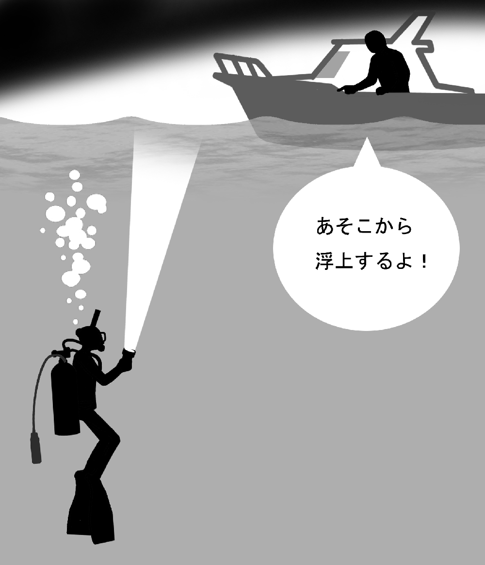 In such a case, ascent carefully by applying the light of the underwater light to the bubbles of the exhaust gas to check the ascending speed, or checking the dive computer and depth gauge.