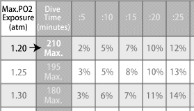 The oxygen exposure limit is 210 minutes shown in the right column.
