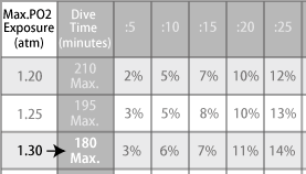 The oxygen exposure limit is 180 minutes shown in the right column.