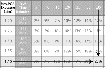 1.40 is the closest number. The oxygen exposure time is stated at 5 minute intervals in the right column, and the oxygen exposure limit ratio in the 35 minute * column is 23%.