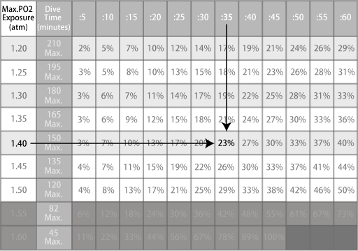 The oxygen ratio of the second dive is the same as the first dive one, so follow the column for oxygen partial pressure 1.40 to the right and look for 77% of your oxygen exposure limit.