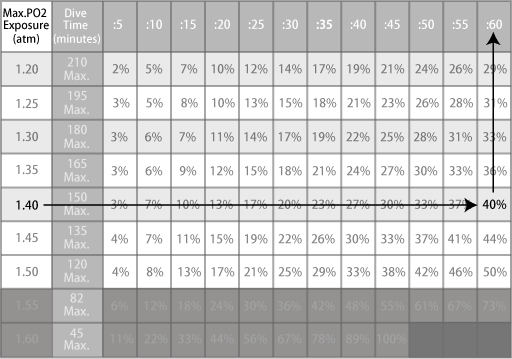 This table only describes oxygen exposure limit ratios up to 40%, so the oxygen exposure limit time is 59 minutes * of 40% oxygen exposure limit ratio.